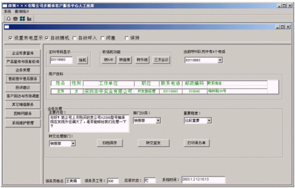◇提高企業(yè)親切感:系統(tǒng)在人工服務(wù)狀態(tài)下,當(dāng)業(yè)務(wù)代表輸入客戶名稱時(shí),系統(tǒng)即時(shí)將客戶與企業(yè)相關(guān)的信息顯示在座席終端上,使業(yè)務(wù)及時(shí)了解客戶,有針對性回答客戶問題,使客戶倍感親切。