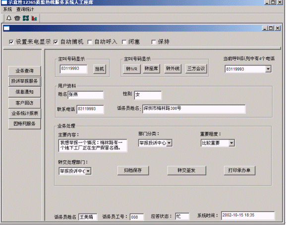 12365質(zhì)監(jiān)熱線服務(wù)系統(tǒng)將接入功能、導(dǎo)航功能、交互式語音應(yīng)答服務(wù)功能、人工座席服務(wù)功能、話路轉(zhuǎn)接功能、信息資料處理緊密聯(lián)系起來。用戶撥打特服電話號(hào)碼后,可以根據(jù)需要選擇人工服務(wù)、交互式語音應(yīng)答服務(wù)、自動(dòng)留言,并能夠在幾種服務(wù)中來回切換或轉(zhuǎn)接其它電話;所記錄的資料可以分門別類的進(jìn)行統(tǒng)計(jì)并形成報(bào)表,供相關(guān)部門進(jìn)行檢索查閱;意見處理完畢,可由座席主動(dòng)呼叫用戶,告知處理意見,形成閉環(huán)處理流程。