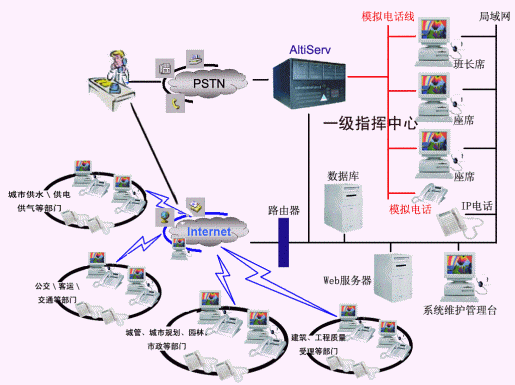 該熱線系統(tǒng)能與Internet、數(shù)據(jù)庫系統(tǒng)很好地集成,實現(xiàn)城市各級部門之間數(shù)據(jù)共享和各種其它不同的業(yè)務功能,以建設部為中心、各職能聯(lián)動2級網(wǎng)絡系統(tǒng)和搶修維護服務端三個部分組成,利用AltiCenter基于IP的分布式呼叫中心技術,可以實現(xiàn)建設部12319服務中心,屬下各個職能部門建立異地分中心,利用現(xiàn)有的PSTN電話網(wǎng)/INTERNET互聯(lián)網(wǎng),將1,2,3級網(wǎng)絡組成一個集語音和數(shù)據(jù)傳輸為一體的多媒體網(wǎng)絡系統(tǒng),并提供對任何方式的服務進行全程錄音、質(zhì)檢功能,最終結果反饋到統(tǒng)一指揮服務中心。