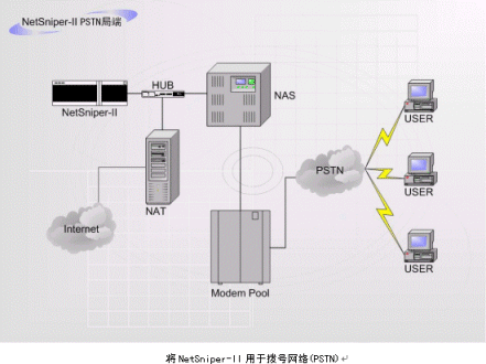 NetSniper-II也可以作為局端設(shè)備,用于xDSL(ADSL/VDSL)、PSTN(電話撥號網(wǎng)絡(luò))、HFC(有線電視網(wǎng)絡(luò))等。此時,NetSniper-II能夠有效的防止控制共享上網(wǎng)、盜用MAC地址上網(wǎng)和Modem回?fù)苌暇W(wǎng)的情況發(fā)生。下面兩個圖例指出了如何將NetSniper-II用于局端。