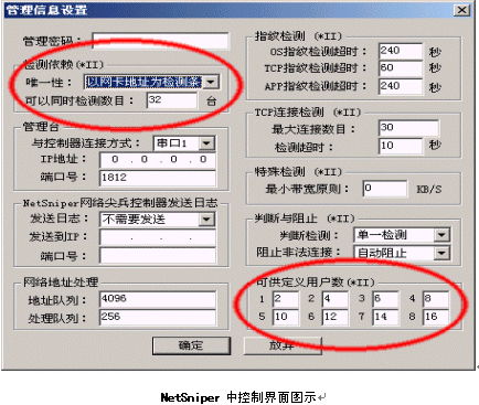 由上圖我們可以看出,NetSniper可以方便地根據(jù)用戶IP地址或MAC地址控制同一網(wǎng)口用戶數(shù)量,用戶數(shù)量控制可以分八級,包括單一用戶和無限用戶的缺省設(shè)置,一共十級。用戶數(shù)量按照按自己的意愿定義每一級用戶可以管理計算機(jī)的數(shù)量,準(zhǔn)確,靈活,是運營商增加接入服務(wù)方式的強(qiáng)大基礎(chǔ)。