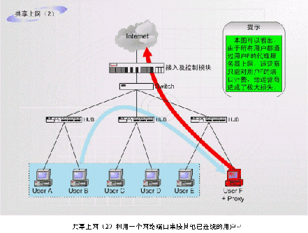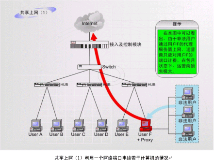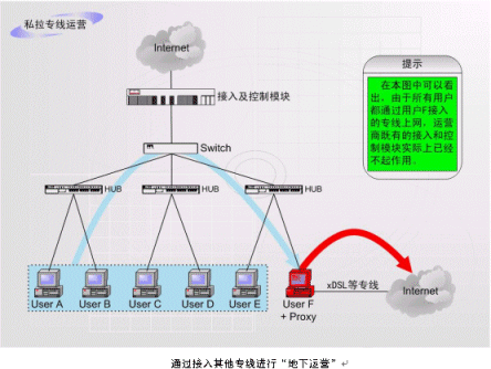 非法運營情況之二:如上圖中的F用戶作為運營商的合法包月用戶,上網(wǎng)服務(wù)開通以后,在自己的計算機(jī)中安裝代理服務(wù)軟件或者安裝路由器,這樣就可以隨時糾集若干住戶分?jǐn)偘沦M用,甚至私設(shè)網(wǎng)吧。