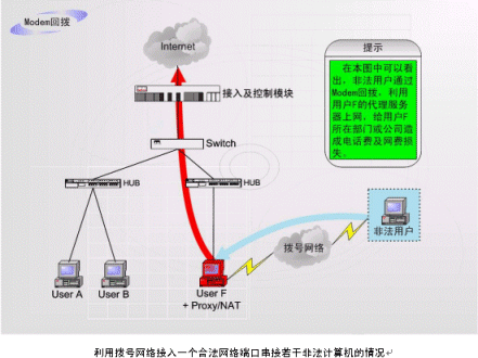 這是在企業(yè)網(wǎng)絡(luò)中常見的情況:如上圖中的F用戶作為企業(yè)的合法用戶,上網(wǎng)服務(wù)開通以后,有操作人員在F計算機(jī)中安裝代理服務(wù)軟件、NAT軟件或者安裝路由器軟件,再安裝Modem等遠(yuǎn)程接入設(shè)備。非法用戶在遠(yuǎn)端通過Modem等接入設(shè)備與網(wǎng)絡(luò)相連接。
