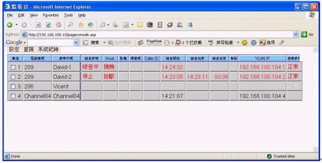 監(jiān)看臺(tái):系統(tǒng)登入后的主畫面,可以監(jiān)控各路電話的當(dāng)前使用情況(包括來(lái)電號(hào)碼、去電號(hào)碼、振鈐次數(shù)、錄音開始時(shí)間、錄音結(jié)束時(shí)間、線路狀況等信息)。并可以實(shí)現(xiàn)對(duì)任意通話的網(wǎng)絡(luò)實(shí)時(shí)監(jiān)聽。