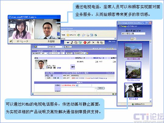 通過“FOMA”的電視電話服務(wù),可以實(shí)現(xiàn)面對(duì)用戶的表情進(jìn)行服務(wù)。而且,例如,可以實(shí)時(shí)把握故障發(fā)生地點(diǎn)等只用語(yǔ)言無法準(zhǔn)確傳遞的信息。進(jìn)而,客服人員可以通過FOMA的電視電話功能送出動(dòng)畫、靜止畫面,利用這些畫面說明情況。通過靈活運(yùn)用這些功能,為實(shí)現(xiàn)顧客和企業(yè)之間的熱情友好、高效細(xì)致的通信提供支持。