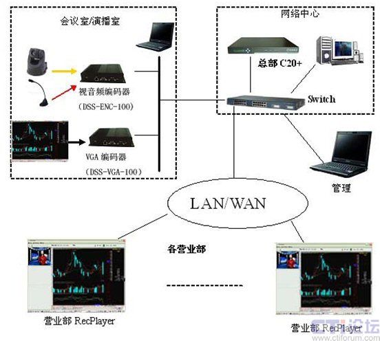 在分析了華安證券的實際需求和網(wǎng)絡(luò)環(huán)境以后,決定采用一套DSS-R-C20+來組建整個流媒體系統(tǒng)。系統(tǒng)由媒體采集系統(tǒng)視音頻編碼器(DSS-ENC-100)/VGA編碼器(DSS-ENC-100),流媒體處理和錄制系統(tǒng)(C20+)和客戶端RecPlayer組成。通過此系統(tǒng)可以實現(xiàn)語音、視頻和計算機(jī)桌面的同步實時直播、錄制和點(diǎn)播。系統(tǒng)的結(jié)構(gòu)圖如下: