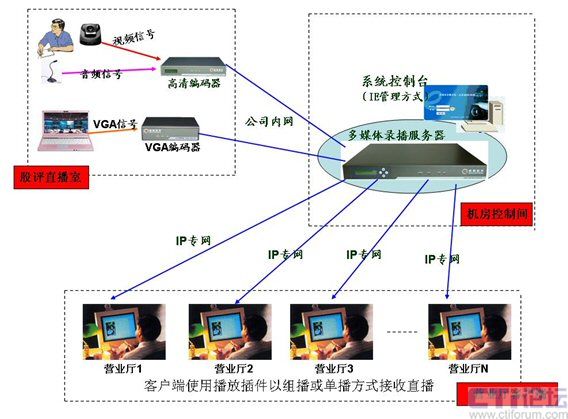 如上圖所示,在多媒體股評(píng)直播室中,股評(píng)師的講解圖像和聲音以及電腦中分析數(shù)據(jù)同步傳輸采集到控制機(jī)房中,通過多媒體錄播服務(wù)器直播模塊的組播方式將信息傳達(dá)給全國遍布的營業(yè)網(wǎng)點(diǎn),實(shí)現(xiàn)股評(píng)直播的需求。(權(quán)威股評(píng)師將在每天下午股市休市后對一天當(dāng)中股票大盤做一次全面的分析,并對本周或某行業(yè)的形式做一個(gè)全面的總結(jié),并對未來形勢做出判斷。)