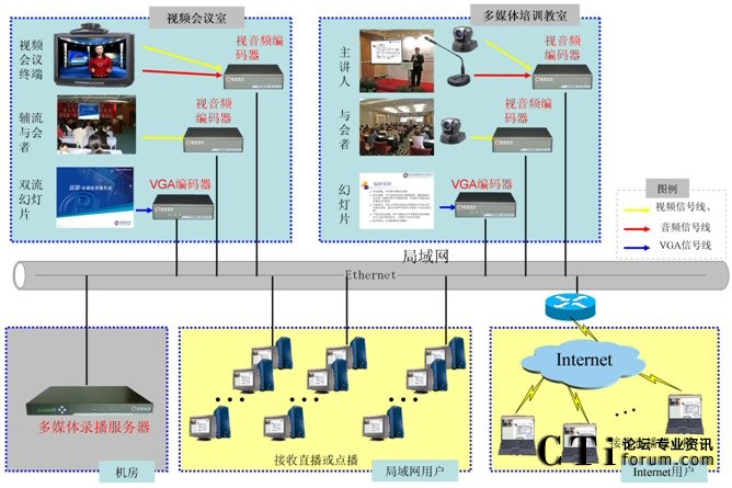 如圖所示,在視頻會議室內(nèi)安裝銳取多媒體錄播系統(tǒng)前端的視音頻編碼器和VGA編碼器,視音頻編碼器負(fù)責(zé)采集視頻會議終端的主流與輔流視頻信號,VGA編碼器負(fù)責(zé)采集幻燈片的VGA圖像內(nèi)容。前端的編碼器采集信號并編碼后通過網(wǎng)絡(luò)發(fā)送給后端機(jī)房內(nèi)的銳取多媒體錄播服務(wù)器,多媒體錄播服務(wù)器接收信號進(jìn)行組合錄制并實時直播到?jīng)]有視頻會議終端覆蓋的分行,會議錄制完畢后就可點(diǎn)播剛錄制的會議視頻。同樣,在多媒體培訓(xùn)教室內(nèi)也安裝了視音頻編碼器和VGA編碼器,在培訓(xùn)時視音頻編碼器負(fù)責(zé)采集培訓(xùn)講師與現(xiàn)場培訓(xùn)的視音頻,VGA編碼器負(fù)責(zé)采集培訓(xùn)講師講解的PPT內(nèi)容圖像,后臺的多媒體錄播服務(wù)器對培訓(xùn)進(jìn)行錄制,并實時直播到各個地市的分行,沒有按時參加培訓(xùn)或需要再次觀看培訓(xùn)的員工可以在培訓(xùn)完畢后點(diǎn)播培訓(xùn)視頻反復(fù)觀看。