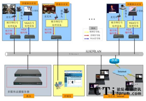 如上圖如圖所示,在兩間多媒體會議室內(nèi)配備了銳取多媒體錄播系統(tǒng)前端的視音頻編碼器和VGA編碼器,視音頻編碼器負(fù)責(zé)采集會議、培訓(xùn)中的視音頻信號,VGA編碼器負(fù)責(zé)采集幻燈片的VGA圖像內(nèi)容。其他普通會議室只使用視音頻編碼器采集視音頻信號。前端的編碼器采集信號并編碼后通過網(wǎng)絡(luò)發(fā)送給后端機(jī)房內(nèi)的銳取多媒體錄播服務(wù)器,多媒體錄播服務(wù)器接收多間會議室的信號進(jìn)行組合錄制、直播、點(diǎn)播。