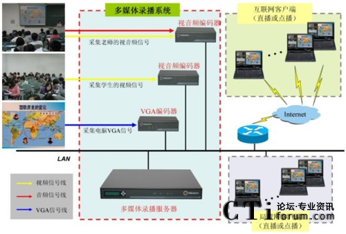 廣州市旅游職業(yè)學校多媒體錄播系統(tǒng)組網(wǎng)如上圖所示。在本項目中編碼器和多媒體錄播服務(wù)器分別部署在教室和機房內(nèi),前端的視音頻編碼器采集老師、學生的視音頻信號,VGA編碼器采集PPT內(nèi)容,編碼器采集信號并編碼后通過網(wǎng)絡(luò)發(fā)送給多媒體錄播服務(wù)器,多媒體錄播服務(wù)器接收并實現(xiàn)同步錄制、直播及事后點播。老師、學生可在教室、辦公室、宿舍等任何可以連接校園網(wǎng)的地方實時觀看教室內(nèi)進行的課程,可滿足日常多媒體教學、課件錄制、微格教學等應用的需要。