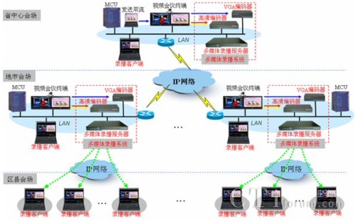 項(xiàng)目中采用了17套銳取高清錄播系統(tǒng),分別部署省國稅及下轄16個(gè)州、市國稅。銳取高清錄播系統(tǒng)采用分布式產(chǎn)品架構(gòu),由多媒體錄播服務(wù)器和前端的編碼器組成。多媒體錄播服務(wù)器部署在網(wǎng)絡(luò)機(jī)房;高清編碼器和VGA編碼器分別部署在高清視頻會(huì)議室,編碼器從華為高清視頻會(huì)議終端獲取視音頻及雙流信號(hào),并通過IP網(wǎng)絡(luò)發(fā)送給機(jī)房?jī)?nèi)多媒體錄播服務(wù)器,由多媒體錄播服務(wù)器實(shí)現(xiàn)視頻會(huì)議的錄制、直播和點(diǎn)播。分會(huì)場(chǎng)及不具備視頻會(huì)議終端的地方,可使用電腦登陸多媒體錄播服務(wù)器來接收會(huì)議的實(shí)時(shí)直播或在會(huì)后進(jìn)行點(diǎn)播。