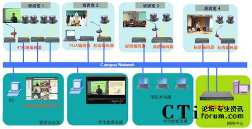 在南洋理工的商學院中有一個培訓中心,培訓中心中有4個培訓課室。 商學院的老師們希望可以把這4培訓課室中的培訓課程錄制下來,并可以同時直播到其它教室。老師可以監(jiān)控這4個培訓課室的培訓情況。學生可以使用PC通過校園網收看到實時的培訓情況,及培訓后的回放他們可能錯過了的培訓。系統(tǒng)可與NTU現有的E_learning系統(tǒng)無縫融合,為為豐富E_learning的課件資源提供低成本、高效率的制作手段。同時系統(tǒng)應該便于維護及用戶界面友好,而且便于以后的擴容。因培訓室的功能差異,每一間培訓室內所需記錄的信號類型及數量均不相同,要求系統(tǒng)能夠進行匹配和適應。