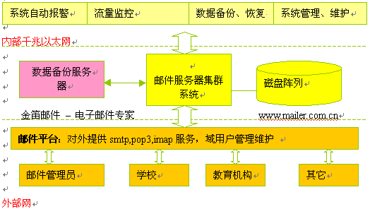 本方案是根據(jù)沈陽(yáng)教育信息中心對(duì)電子郵件系統(tǒng)大容量、高擴(kuò)展性、分級(jí)管理的實(shí)際要求,結(jié)合金笛郵件集群系統(tǒng)的技術(shù)特點(diǎn),本著高速穩(wěn)定、易于管理、易于維護(hù)、適度超前的原則,可以作為實(shí)施方案的參考。