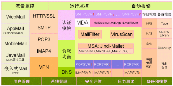 1. 郵件集群系統(tǒng)由二個(gè)smtp server、一個(gè)pop3/imap server、一個(gè)認(rèn)證服務(wù)器ldap、和磁盤陣列組成。監(jiān)控中心由流量監(jiān)控、運(yùn)行監(jiān)控、SMS報(bào)警、系統(tǒng)管理、查詢運(yùn)維終端組成。