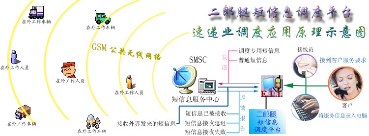 二郎腿短信息調(diào)度平臺(tái)是利用目前社會(huì)上大眾普遍擁有手機(jī)的現(xiàn)成資源,通過移動(dòng)通訊公司提供的短信息服務(wù)功能作為通信信道,直接對(duì)手機(jī)進(jìn)行低層操作控制,以“收發(fā)短信息”的方式來(lái)實(shí)現(xiàn)信息的傳遞(通信資費(fèi)標(biāo)準(zhǔn)與在手機(jī)上收發(fā)短信相同)。調(diào)度平臺(tái)還對(duì)每條發(fā)出的信息的接收狀態(tài)進(jìn)行跟蹤,確保信息能被安全