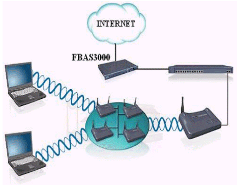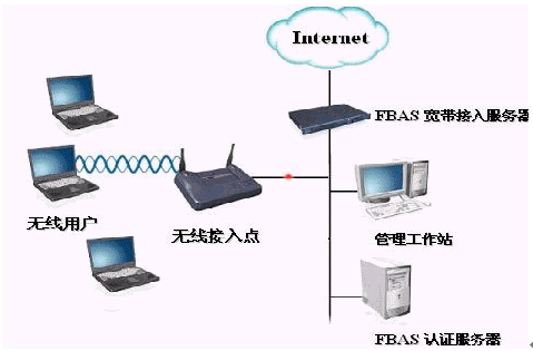 移動用戶通過自身的無線網(wǎng)卡傳遞信息到熱點接收器上,熱點接收器連接到交換機(是為了能具有更好的可拓展性),交換機連接到華夏科技FutureWorks寬帶計費系統(tǒng)的FBAS接入服務(wù)器上,通過接入服務(wù)器連接到INTERNET.這里的FBAS3000系列的寬帶接入服務(wù)器采用的是一體機的模式,接入,認證,計費等一系列服務(wù)均安裝在FBAS里,這樣可以簡化網(wǎng)絡(luò)結(jié)構(gòu)。對FBAS的操作是通過WEB頁面來進行設(shè)置維護的, 而不用再接入其它的服務(wù)器或管理計算機了。這種網(wǎng)絡(luò)結(jié)構(gòu)對于那些要求操作簡單,維護便利的客戶是一種非常直接有效的方案。