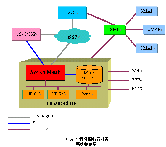 個性化回鈴音業(yè)務是基于智能網(wǎng)平臺實現(xiàn)的全新增值智能業(yè)務,采用被叫簽約信息T-CSI觸發(fā)的方式。具體實現(xiàn)時利用現(xiàn)有智能網(wǎng)結構,將業(yè)務邏輯加載在SCP上,MSC/SSP根據(jù)用戶的歸屬HLR中的T-CSI信息,觸發(fā)智能業(yè)務到用戶歸屬的SCP上,并進行相應的業(yè)務控制處理。在呼叫過程中,由SCP控制獨立IP,向用戶提供音樂回鈴音。其中的Switch Matrix即為東信CS21-IPS設備,為IIP-CN的實現(xiàn)提供了TCAP/SCCP/MTP的信令功能,為IIP-RN提供了ISUP信令和前置交換功能。作為穩(wěn)定可靠的前置交換平臺,為運營商提供有效的增值空間,為用戶提供了優(yōu)質的服務。