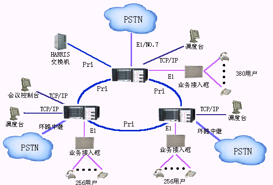該方案適用于用戶需要建立自己的通信網(wǎng)并能實(shí)現(xiàn)行政交換、電話會(huì)議、調(diào)度交換、語(yǔ)音信箱等多種功能。這種方案解決的業(yè)務(wù)種類(lèi)多,能滿足用戶的多種需要。
