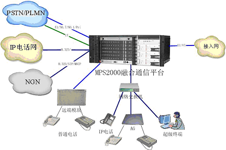 MPS2000融合通信平臺組網(wǎng)能力強大,能夠提供數(shù)字中繼、模擬中繼(包括環(huán)路中繼、二/四線中繼等各種模擬中繼)、IP中繼等硬件接口,在信令協(xié)議上支持NO.7、NO.1、Pri等信令以及H.323、SIP、MGCP等協(xié)議。平臺能夠與數(shù)字網(wǎng)、模擬網(wǎng)、數(shù);旌途W(wǎng)、IP電話網(wǎng)、NGN(下一代網(wǎng)絡)等現(xiàn)有的各種網(wǎng)絡進行組網(wǎng)。