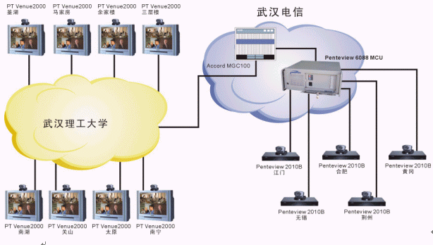 武漢理工大學(xué)的遠(yuǎn)程教學(xué)系統(tǒng)由于分3期建設(shè),網(wǎng)絡(luò)條件較為復(fù)雜。一期主要以PT的Venue2000終端+Accord MGC100 MCU為主,是一個(gè)H323系統(tǒng);二、三期采用中太多媒體的Penteview2010終端+Penteview6088MCU,是一個(gè)H320系統(tǒng),兩套系統(tǒng)通過網(wǎng)關(guān)無縫結(jié)合到一起工作,用戶根本感覺不到不同。各教室均同時(shí)采用了中太多媒體的遠(yuǎn)程教學(xué)支撐系統(tǒng),通過對(duì)Penteview會(huì)議電視系統(tǒng)的擴(kuò)充,實(shí)現(xiàn)了以下功能,使教學(xué)應(yīng)用更加方便: