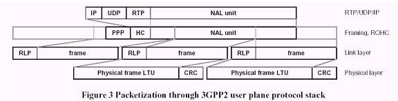 因為包交換服務(wù),3GPP/3GPP2同意了一個基于IP的協(xié)議棧。圖3展示了一個NAL單元通過3GPP2用戶平面協(xié)議堆棧被封裝在RTP/UDP/IP的典型過程。在頭壓縮(RoHC)后,此IP/UDP/RTP包被封裝進一個PDCP/PPP2包,變成了頻率鏈路控制(RLC)和服務(wù)數(shù)據(jù)單元(SDU)。RLC協(xié)議可以在三種模式下工作:透明、非確認和確認模式。RLC協(xié)議為用戶和數(shù)據(jù)提供分段和重傳服務(wù)。在透明和非確認模式,RLC被定義為單向的;在確認模式,RLC被定義為雙向的。對於所有的RLC模式,循環(huán)冗余檢查(CRC)的錯誤檢測在物理層上被運行,而且CRC檢查的結(jié)果和真實的數(shù)據(jù)一起被遞送到 RLC。在透明模式中,沒有上層的協(xié)議被增加到較高層的數(shù)據(jù)中。錯誤的協(xié)議數(shù)據(jù)單元(PDUs)可以被丟棄或標(biāo)記為錯誤。在非確認模式中,沒有重傳協(xié)議在使用中,而且數(shù)據(jù)傳送沒有保證。接受到的錯誤數(shù)據(jù)根據(jù)配置來決定丟棄或標(biāo)記為錯誤。在確認模式中,一種自動的重復(fù)請求機制被用于錯誤訂正。