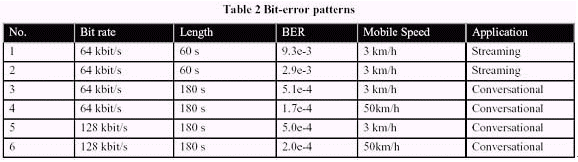 在H.264/AVC的標(biāo)準(zhǔn)化進程中,移動視頻傳輸?shù)闹匾砸呀?jīng)在3G移動傳輸里面通過對基于H.324M的電路交換會話服務(wù)、包交換會話和流服務(wù)得到了證實。這些測試情況允許適當(dāng)?shù)木幋a特征、測試和容錯仿真等特征的選擇,同時也可以得到有意義的測試結(jié)果。在本文,我們將會把重心集中在基于IP的測試情況。在正常的測試情況下,我們會定義6個測試情形組合,主要測試通過3G移動網(wǎng)絡(luò)的包交換會話服務(wù)和包交換流媒體服務(wù)。另外,測試環(huán)境包括簡單的脫機3GPP/3GPP2仿真軟件、程序接口和評估標(biāo)準(zhǔn)。無線信道使用專門生產(chǎn)用于移動無線信道仿真的位率差錯模板來進行仿真。 位率差錯模板在物理層上和RLC/RLP層下來捕獲,因此,它們在實驗被用于物理層仿真。通過位率差錯模板實驗中得出的碼率、長度、位錯誤率和移動速度數(shù)據(jù)詳見下表2。