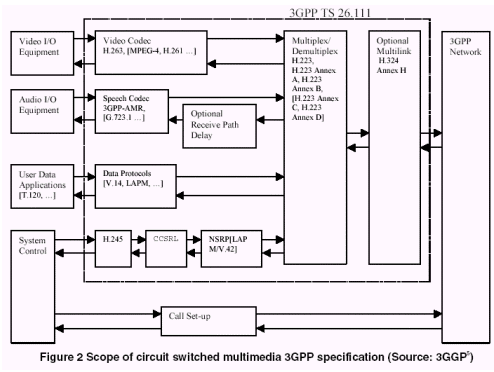 3G網(wǎng)絡(luò)上用于視頻通訊的3GPP標(biāo)準(zhǔn)定義了使用于視頻消息傳送(參看3.3部分)和視頻呼叫的視頻解碼器。在交換線路上實行64kbps速率的實時呼叫時,H.263是推薦標(biāo)準(zhǔn),如圖2所示?蛇x的其他視頻解碼器中,MPEG-4和H.261不是標(biāo)準(zhǔn)所要求的,但可作為可能的候選標(biāo)準(zhǔn)。