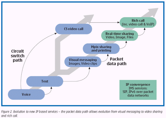 首個(gè)IP整合服務(wù)(例如視頻共享和內(nèi)容共享)是向豐富的通話方式發(fā)展的關(guān)鍵。這是一個(gè)以語音、視頻和文本為形式的基于會話通訊的概念,它支持在會話參與者之間共享相同的內(nèi)容,例如圖片、數(shù)據(jù)和其它增值信息。