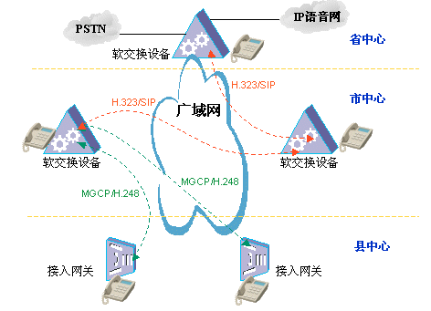 針對這種體系結(jié)構(gòu),軟交換技術(shù)就大有可為了,各地市布置軟交換設(shè)備,其間采用H.323/SIP點對點局間協(xié)議,負(fù)責(zé)各軟交換機之間的通信,在地市到縣區(qū)之間采用MGCP/H.248協(xié)議,這種協(xié)議體系充分吸取了軟交換體系控制與業(yè)務(wù)分離的思想,具有高度靈活性,可以兼容PSTN、運營商IP語音網(wǎng)、原有PBX系統(tǒng)等,并且從多方面保障話音質(zhì)量;管理上由地市軟交換設(shè)備對縣區(qū)的接入網(wǎng)關(guān)設(shè)備進行統(tǒng)一管理,號碼進行統(tǒng)一分配;同時,由地市軟交換設(shè)備提供多達數(shù)十種增值業(yè)務(wù),可以實現(xiàn)業(yè)務(wù)的統(tǒng)一升級,簡單方便。