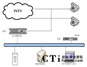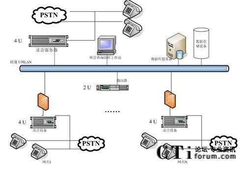 用戶需要建設(shè)一套“分布錄音,集中管理”的電話錄音系統(tǒng),在中心點(diǎn)有16個坐席,總計(jì)各縣有11點(diǎn)網(wǎng)點(diǎn),每網(wǎng)點(diǎn)有8個坐席(項(xiàng)城16個)。中心和各網(wǎng)點(diǎn)之間用聯(lián)通的專網(wǎng)連接。用戶需要在聯(lián)通專網(wǎng)上進(jìn)行數(shù)據(jù)傳輸。