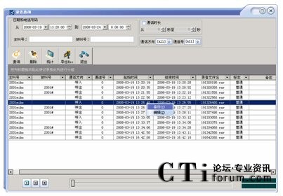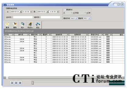 可按通道號,日期,時間,撥出/入電話號碼等多種方式進(jìn)行單個和組合查詢,查詢方便快捷,數(shù)據(jù)表的下邊還顯示出數(shù)據(jù)資料的統(tǒng)計(jì)。并可根據(jù)通話內(nèi)容及聯(lián)系人等重要信息對錄音文件進(jìn)行編輯?梢匀我獠シ乓粋錄音或選擇多個錄音依次播放,放音時將彈出當(dāng)前語音文件的放音進(jìn)度等信息。