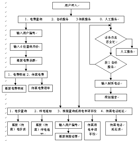 如選擇自動查詢,則可用電話收聽語音查詢信息或用傳真機接收查詢信息。自動語音查詢:通過給用戶語音提示按鍵選擇這樣的交互方式,可以以語音方式獲得如下用電信息:電費、用戶信息;居民用電電價、普通用電電價、大量用電電價、高需求用電電價;用電占請報裝手續(xù)、減容用電手續(xù)、暫停用電手續(xù)、恢復用電手續(xù)、遷移變壓器手續(xù);增容帖費標準。自動傳真查詢:通過給用戶語音提示按鍵選擇這樣的交互方式,可以以傳真方式獲得如下用電信息:電費、用戶信息;居民用電電價、普通用電電價、大量用電電價、高需求用電電價;用電占請報裝手續(xù)、減容用電手續(xù)、暫停用電手續(xù)、恢復用電手續(xù)、遷移變壓器手續(xù);增容帖費標準。