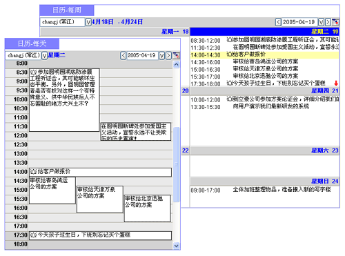上圖"日歷管理"就借鑒了圖形化交互方法來安排日程和任務(wù)。這與您曾經(jīng)用過的桌面臺歷或記事本一樣,無需介紹就一目了然,并且要比在紙張上勾勾寫寫更方便、更有好處。例如,您此前計劃過日程,實際執(zhí)行有些變化,之后托托拽拽那個日程就可修改開始時間、持續(xù)時間,或修改主題內(nèi)容,有效提高了記錄工作日程的效率;又例如,可以根據(jù)需要設(shè)定"提醒"--即便對過期的、未及時處理的工作安排隨后也會提示,有了這樣的人性化服務(wù)助手,員工自然歡喜。