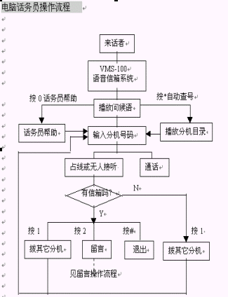 2. 在使用了電腦話務(wù)員忙轉(zhuǎn)接功能的情況下,當分機占線時如果您選擇了留言,系統(tǒng)便將您的電話接通至相應(yīng)的留言信箱;當分機無人接聽時交換機啟動無應(yīng)答呼叫轉(zhuǎn)移功能,將您的電話重新接回到VMS-100