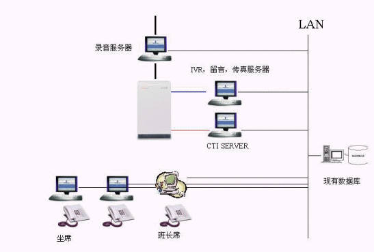 按照用友北京分公司行業(yè)特點(diǎn)、現(xiàn)狀和需求,呼叫中心系統(tǒng)采用愛立信MD110交換機(jī),加配CTI接口設(shè)備,配合我公司的CTILink和IVR服務(wù)器,實(shí)現(xiàn)呼叫中心的全部功能。該系統(tǒng)中繼線采用數(shù)字中繼線(30B+D),16路IVR系統(tǒng)和20個人工坐席,處理用戶申告業(yè)務(wù)。