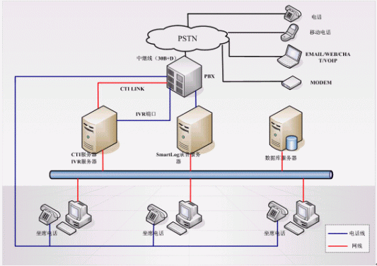 呼叫中心前端通信平臺(tái),主要由SIEMENS HiPath系列交換機(jī),計(jì)算機(jī)電話集成服務(wù)器(UltraCTI),交互式語音應(yīng)答服務(wù)器(ctsIVR),在線錄音監(jiān)聽服務(wù)器(SmartLog),數(shù)據(jù)庫服務(wù)器,MCI服務(wù)器以及傳真服務(wù)器幾個(gè)部分組成。中繼線多采用30B+D或2B+D接入。