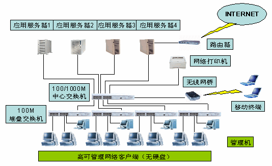 為保證能夠提供更多的應(yīng)用服務(wù),E&E管理機需配備較大容量的硬盤(60G以上),如果在管理機上安裝有比較重要的系統(tǒng)或軟件,更可以在E&E管理機上增加硬盤實現(xiàn)RAD1或RAID5,最大的保護系統(tǒng)運行。E&E管理機運行在100M交換網(wǎng)絡(luò)環(huán)境中。