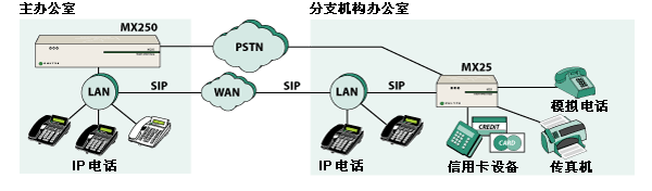 MX25 是一種能夠在兩種不同模式下工作的模塊化設(shè)備。在其中一種工作模式下,MX25 是一個(gè)通向 PSTN 網(wǎng)關(guān)的獨(dú)立 SIP。當(dāng)在這種模式下工作時(shí),MX25 轉(zhuǎn)換電話呼叫的格式,使其可以在 IP 網(wǎng)絡(luò)與公用電話網(wǎng)絡(luò)之間傳遞。另一種工作模式是,將 MX25 作為 MX250 的功能延伸系統(tǒng),用于不超過(guò) 25 個(gè)用戶(hù)的分支辦公室。在這種配置下,MX25 與 MX250 通信并交換有關(guān)用戶(hù)和設(shè)備的信息。即使連接 MX250 和 MX25 的 WAN 鏈路出現(xiàn)故障,MX25 也能繼續(xù)工作并處理來(lái)自/發(fā)往 PSTN 的傳入/傳出呼叫。