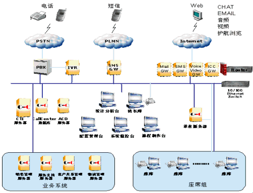 。。系統(tǒng)采用PBX提供完備的呼叫控制功能,能夠滿足呼叫中心電話應(yīng)用的需要,實(shí)現(xiàn)呼入、呼出、內(nèi)部通話、保持、接回、咨詢、轉(zhuǎn)接、會議等各種電話控制功能;同時(shí),PBX具有CTILink接口,可實(shí)現(xiàn)與計(jì)算機(jī)系統(tǒng)的連接。