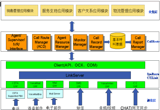 。。CallRoute平臺是一個(gè)基于CSTA標(biāo)準(zhǔn)、支持分布互連的呼叫中心平臺。商路通呼叫中心平臺全套產(chǎn)品包括多個(gè)服務(wù)部件,客戶端的接口部件(OCX、DLL)以及功能豐富應(yīng)用工具。我們的軟件系統(tǒng)采用先進(jìn)的軟件工程設(shè)計(jì)方法,整個(gè)系統(tǒng)的軟件結(jié)構(gòu)體系遵循以下設(shè)計(jì)原則: