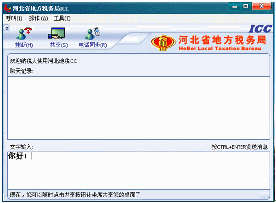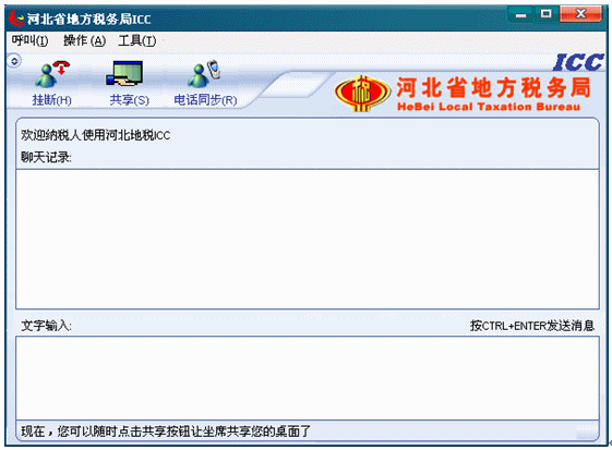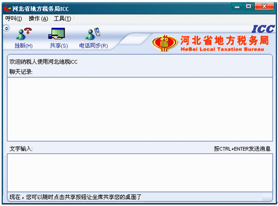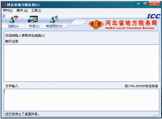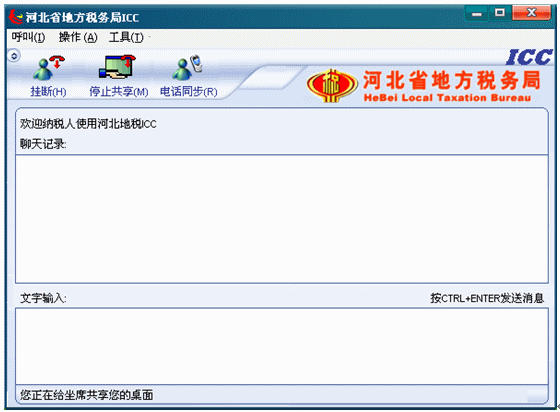 9.遠(yuǎn)程共享:點擊ICC界面中的共享按鈕,納稅人電腦的桌面背景將被置成一種單一的顏色并且共享按鈕變成停止共享按鈕,座席在遠(yuǎn)端就可以看到納稅人的桌面,并能操作納稅人的桌面,此時左下角狀態(tài)欄提示“您正在給座席共享您的桌面”。如下圖: