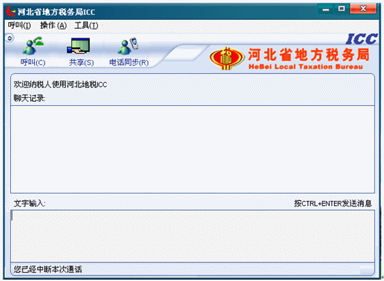 10.掛斷:如果納稅人想中止和此座席的通信(文本交談和遠(yuǎn)程共享),納稅人可以點擊掛斷按鈕。掛斷后左下角狀態(tài)欄提示“您已經(jīng)中斷本次通話”。如下圖: