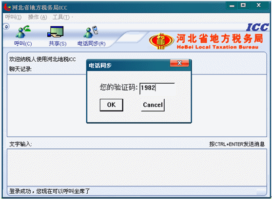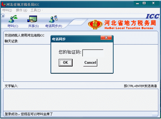 11.電話同步(一種直接呼叫指定座席的功能):如果納稅人先撥打12366,正在和河北省地市的某一座席通電話。此時,納稅人需要此座席向納稅人提供ICC的幫助(文本交談和遠(yuǎn)程共享),納稅人就不能直接點擊呼叫按鈕,因為納稅人點擊呼叫按鈕系統(tǒng)將把納稅人的呼叫轉(zhuǎn)向納稅人呼叫地市的任意空閑座席,可能納稅人的呼叫就不能被轉(zhuǎn)到此時和納稅人通話的座席。準(zhǔn)備電話功能就能幫助納稅人直接呼叫到和納稅人通電話的座席。具體做法如下:通過電話,向和納稅人通電話的座席要一個驗證碼,讓后點擊準(zhǔn)備電話按鈕,此時將出現(xiàn)一個“電話同步”的對話框,如下圖: