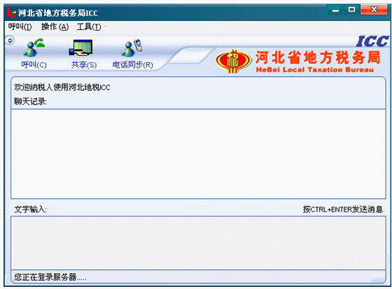 4.選擇城市,點擊確定后,出現(xiàn)ICC界面,此時ICC處于登錄服務(wù)器狀態(tài),左下角的狀態(tài)欄有文字提示“您正在登錄服務(wù)器……”。如下圖: