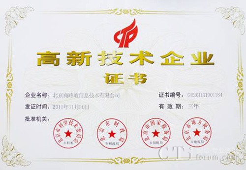 CTI論壇(ctiforum)3月23日消息(記者 浩宇):商路通再傳喜訊,2012年3月12日商路通獲得了“國家級高新技術(shù)企業(yè)”證書,(證書編號:GR201111001184,有效期三年),這標(biāo)志著商路通發(fā)展的又一個(gè)新的里程碑。