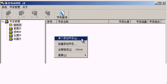 如果你要添加大量的節(jié)目,就需要用到"批量添加節(jié)目"這個(gè)功能了。批量添加又分為按目錄、按文件和添加連續(xù)劇3種。按目錄方式就是把一個(gè)文件夾里的所有流媒體文件全部加進(jìn)去;按文件方式就是手動(dòng)選擇多個(gè)文件添加;添加連續(xù)劇和按文件差不多,不同的是添加的多個(gè)文件共用一個(gè)連續(xù)劇名稱在網(wǎng)頁里出現(xiàn),你要點(diǎn)了連續(xù)劇的名稱進(jìn)入后再點(diǎn)想看的集數(shù)來觀看。