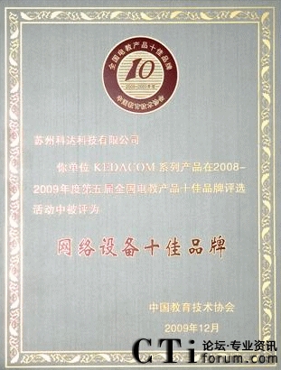 CTI論壇(ctiforum)12月14日消息(記者 張塵):2009年12月4日,由國內教育權威機構“中國教育技術協(xié)會”主辦,以讀者調查問卷的形式舉行的第五屆全國電教產品十佳品牌頒獎典禮在福州梅峰賓館盛大開幕,科達教育視頻會議產品憑借卓越的產品性能和良好的客戶服務入選網(wǎng)絡產品類十佳之列,同時也成為首個入選十佳品牌的視頻會議產品。