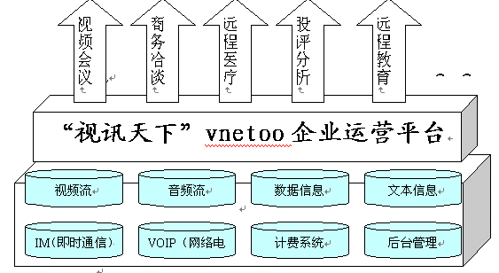 VNETOO視訊運營平臺具有強大的數(shù)據(jù)功能和優(yōu)質的音視頻效果,是集"視頻+語音+數(shù)據(jù)+IM(即時通信)+VOIP(網絡電話)+計費+后臺管理"的基于IP網絡世界一流視訊服務提供平臺,它革命性地開創(chuàng)了視訊運營領域的全新模式。(見圖表一:"視訊天下"vnetoo運營平臺結構)。
