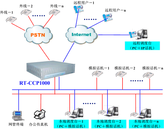 融天科技一體化IP調(diào)度指揮系統(tǒng)RT-CCP1000充分融入了先進的VOIP技術(shù),支持遠(yuǎn)程IP用戶接入/遠(yuǎn)程調(diào)度模式,該調(diào)度系統(tǒng)可廣泛地適用于部隊、鐵路、水力、電力、航空、礦山、石油、冶金、化工等企業(yè)與單位,系統(tǒng)組網(wǎng)圖大致如下:
