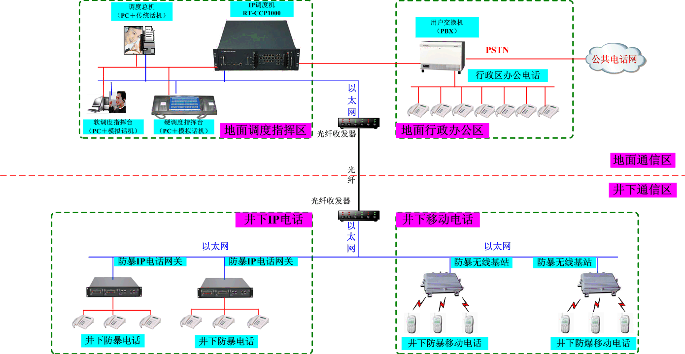 在傳統(tǒng)調(diào)度技術(shù)基礎(chǔ)上完美的將固話網(wǎng)絡(luò)、IP網(wǎng)絡(luò)、無線網(wǎng)絡(luò)充分融合,可以實(shí)現(xiàn)井上調(diào)度指揮區(qū)及井上行政辦公區(qū)、井下IP電話及井下移動(dòng)電話的互通,也能提供接口與原有的行政辦公電話無縫整合。同時(shí)也完美的解決了不同網(wǎng)絡(luò)之間、多套系統(tǒng)之間存在兼容性差、共享性差、重復(fù)投資、操作復(fù)雜等諸多缺陷。